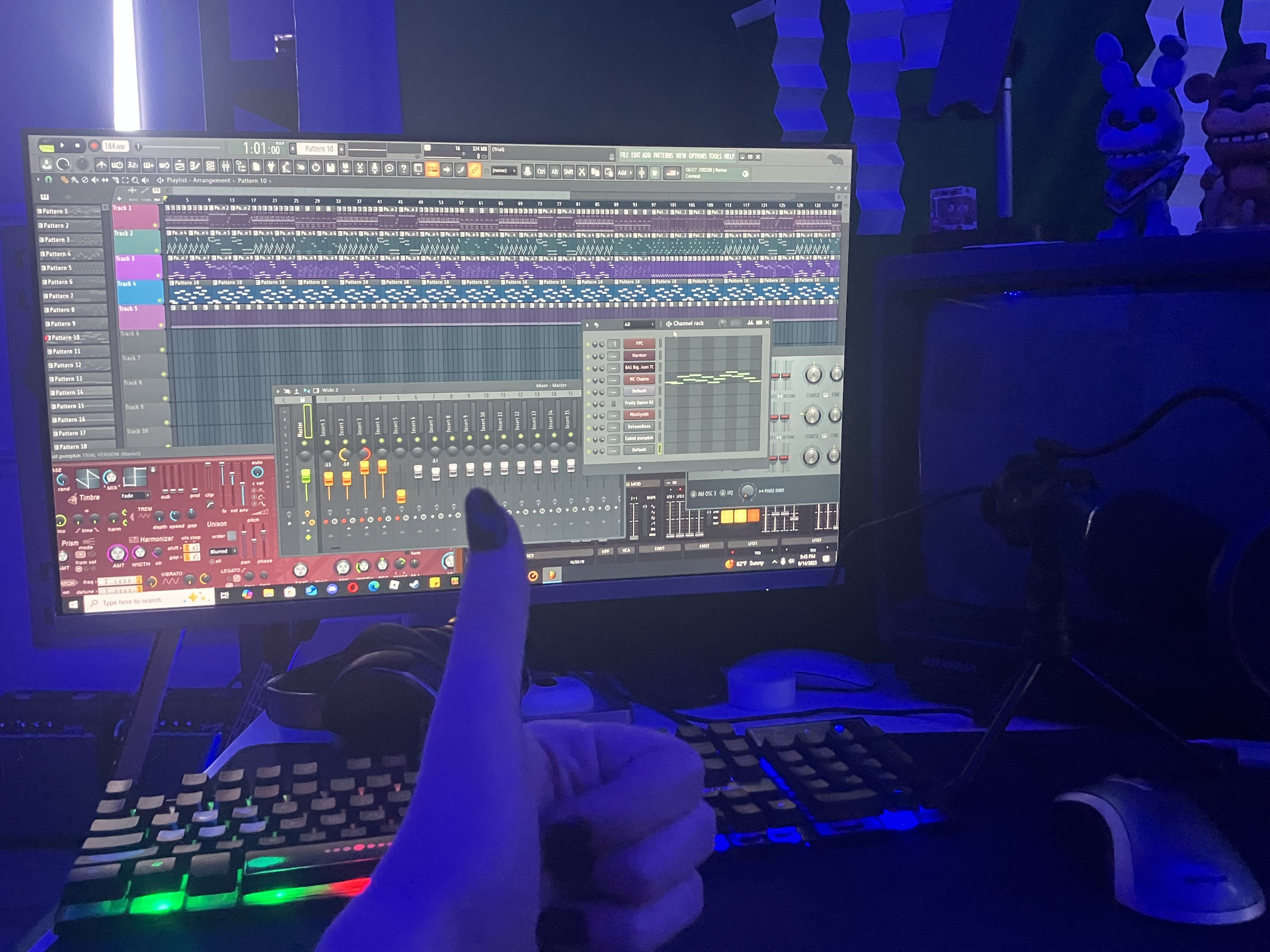 A desk with my monitor, keyboard, microphone, etc, an old TV, my PC, some FNAF stuff (my desk is kinda FNAF themed, hence the fan and paperpals), my greenscreen, flowers (very dead), a candle, and some sketchbooks :0